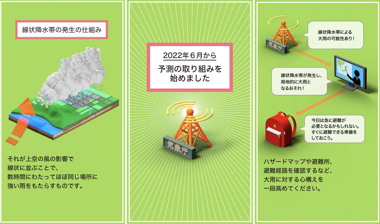 ■予測が難しい現象であるが、2022年6月1日から、複数の県にまたがる広域を対象に、線状降水帯による大雨となる可能性を半日程度前から気象情報において呼びかける取組が開始された。