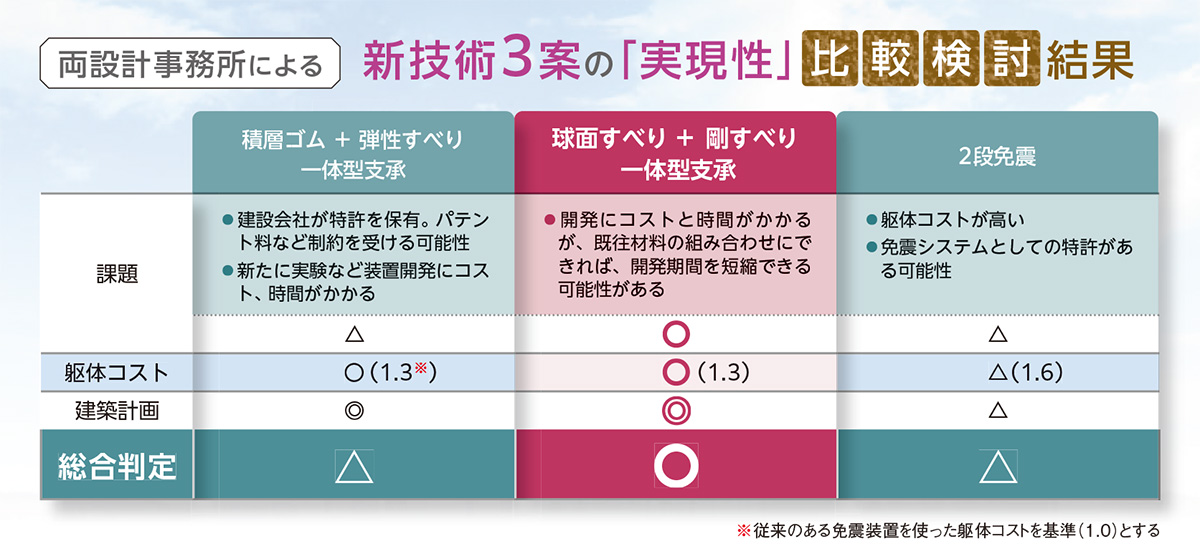 田山 当社が選定された令和2年4月の設計プロポーザルにおいては、「南海トラフ地震に対応した安心安全な構造計画」が求められました。しかし、与えられた模擬地震波を分析すると、従来の免震装置単体では対応できないことがわかりました。そのため、具体的な免震構造の決定については、設計プロポーザル後の検討となりました。そこで我々は、福和伸夫教授とともに検討を重ねた結果、従来の免震装置の性能限界を超えた揺れが発生した場合には建物全体を滑らせ、二段階で地震のエネルギーを吸収するという発想をとることとしました。そのうえで、具体的に3つの技術案(下表参照)を提示し、検討を重ねてきました。
