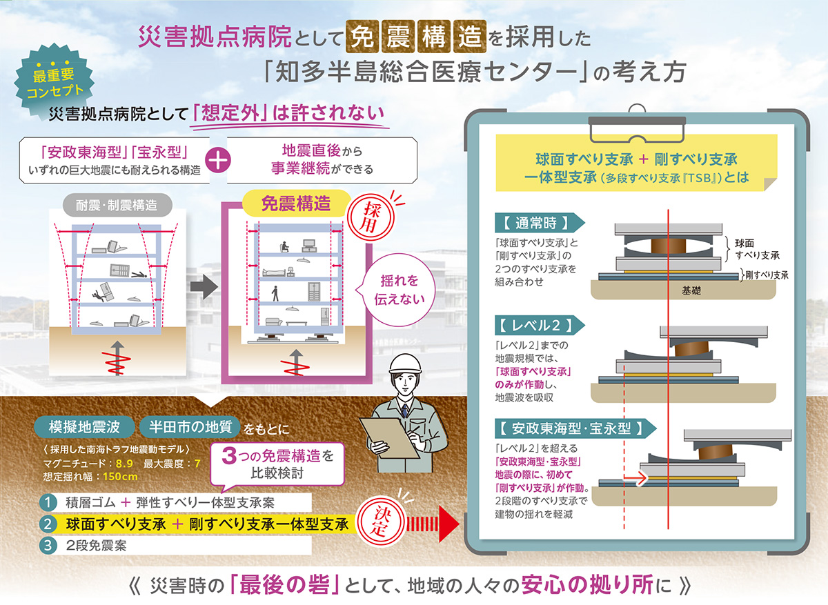 当センターは、知多半島医療圏における災害拠点病院であり、知多半島唯一の三次救急医療施設となります。そのため、建設にあたっては、「想定外」という言い訳は許されない施設として、どのような災害が起きても病院機能を維持することを使命と位置づけ、施設構想を練りました。建設地となる半田市は、南海トラフ地震の想定震源域に近く、市役所の建て替えにおいても、「免震構造でなければ機能が維持できない」との結論から免震構造を採用した経緯があり、当センターにおいても「免震構造の導入」は当初から前提にありました。そのうえで、内閣府の「南海トラフ巨大地震対策検討ワーキンググループ」で主査を務める名古屋大学の福和伸夫教授(当時)に協力を仰ぎ、建設地における模擬地震波の作成、具体的な免震装置の選定にあたってのアドバイスをいただきました。