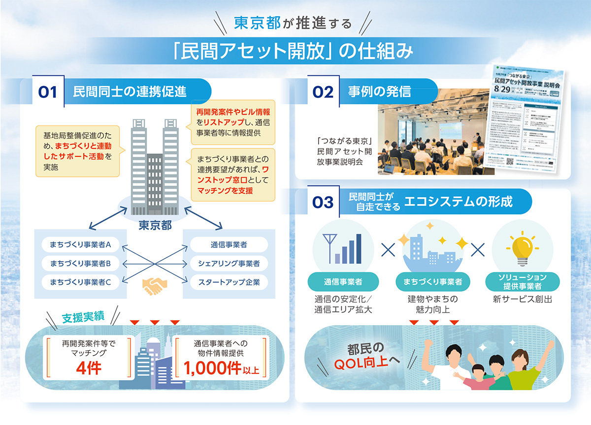 石川 こうした課題を解決するため、都は基地局設置に利用できる民間所有の建物・土地の情報を通信事業者に提供する「民間アセット開放」に着手しました。「まちづくりとの連携」と「既存のビル等建築との連携」の2軸でアプローチし、デベロッパーなどの「まちづくり事業者」や物件所有者と、通信事業者をつなぎ、基地局の設置を促す取り組みです。