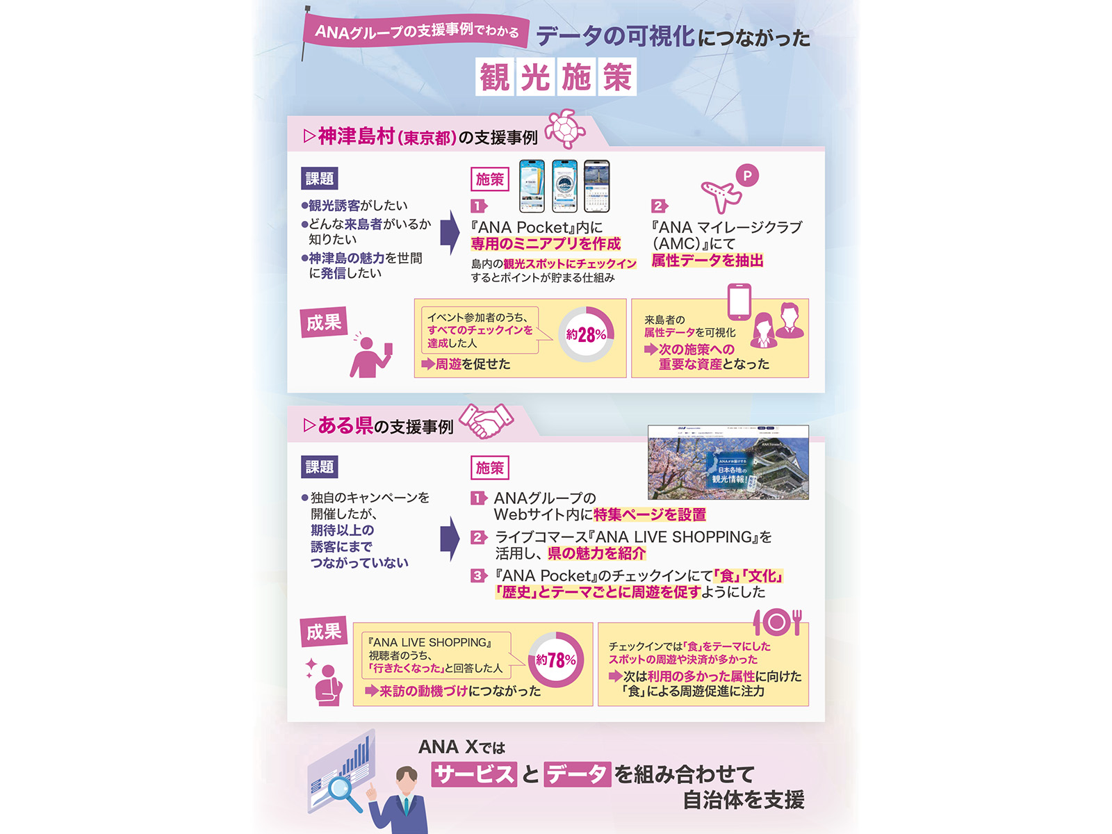 それでは、2つの支援事例を紹介します。1つ目は、神津島村(東京都)を支援した事例です。伊豆諸島のほぼ中間に位置する神津島村では、「観光誘客がしたい」「どんな来島者がいるか知りたい」「神津島の魅力を世間に発信したい」といった課題を持っていました。そこで、神津島を応援する共同制作イベントが開催され、ANAグループとしても参加しました。我々は、『ANA Pocket』内に神津島専用のミニアプリを作成しました。そして、島内の観光名所をアプリ内の地図上で「見える化」するとともに、そこに「チェックイン」すると、ポイントが貯まる仕組みを導入しました。結果、イベント参加者の約28%がすべてのチェックインを達成し、島内での周遊をうながせました。また、『AMC』の会員情報によって来島者の属性を可視化することができ、次の施策を策定するための重要な資産となりました。