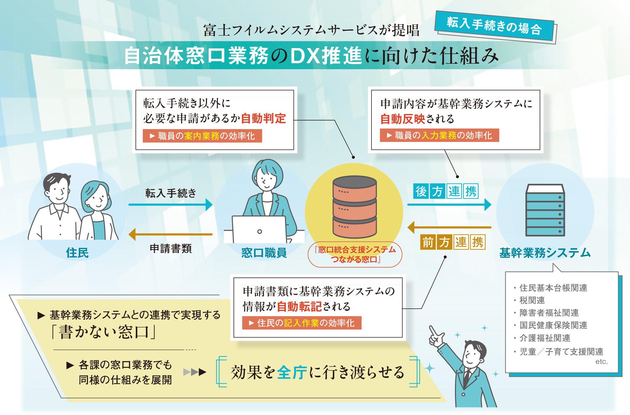 *後方連携:窓口手続きで記載した内容を基幹業務システムへ反映し、情報連携を図ること