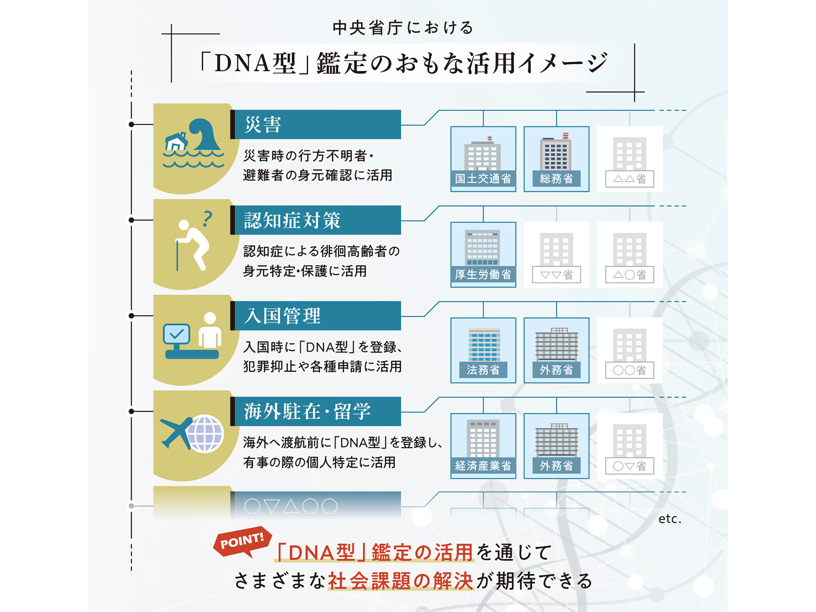 これらはあくまでも一部にすぎず、今後もさらに用途が広がっていくことが考えられます。実際に海外では、「DNA型」情報の社会的な活用が進んでおり、日本での今後の活用促進の参考になるかもしれません(下部先進事例コラム参照)。