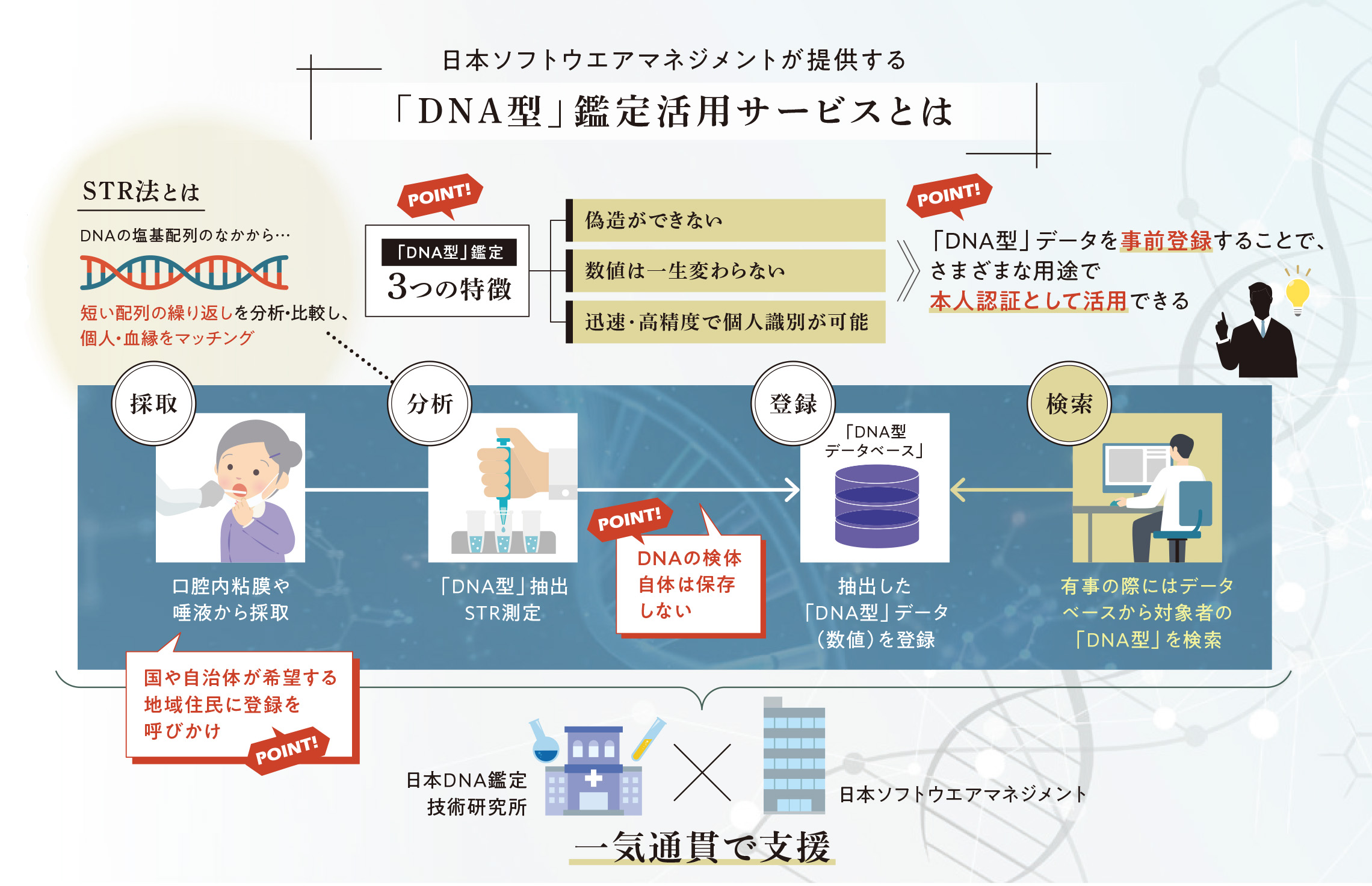 一方の日本ソフトウエアマネジメント社も長年、当研究所とともに捜査機関への協力をともに行ってきたパートナーであり、すでに親子鑑定の分野では「DNA型」鑑定のサービス展開の実績もあります。国際認証を取得し、個人情報の管理を伴う自治体の情報システムを多数開発・運用してきた実績もあることから、機密性の高い「DNA型」情報を管理する事業者としてふさわしい存在です。