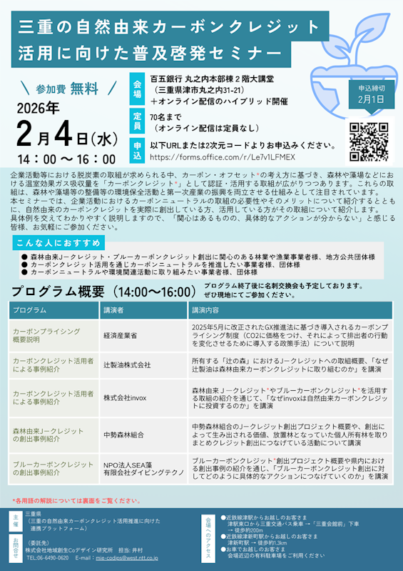 <2/4(水)開催>三重県主催「三重の自然由来カーボンクレジット活用に向けた普及啓発セミナー」を企画・運営します