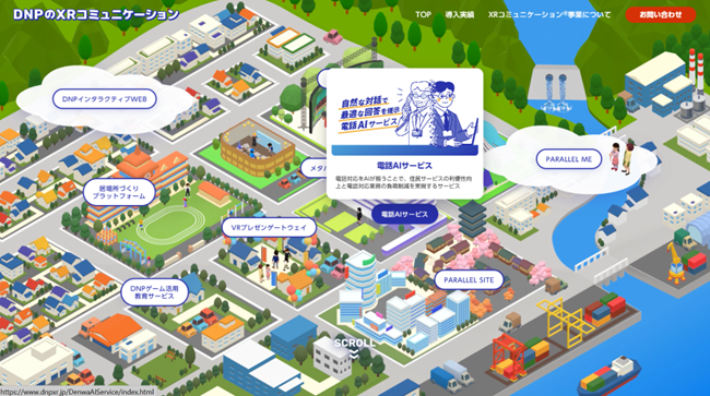 トップページでは、DNPのXRコミュニケーションの商材をマップ上のイラストに配置し、直感的にサービスを探せるようにしています。例えば、自治体窓口の問い合わせ対応を支援する「電話AIサービス(※1)」や「メタバース役所(※2)」など、気になる商材は各ページで概要を確認できます。