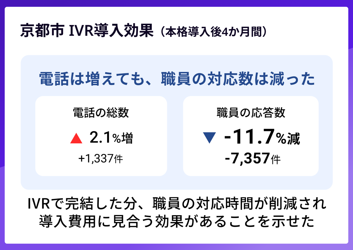 浜本(京都市):本格導入後の4カ月間で、受電数・IVR受電数・職員応対数などを集中的に計測し、前年同時期と比較しました。電話の総数は前年比で2.1%増加した一方、職員の応答数は11.7%減少しました。電話が増えても職員の対応件数は減っており、IVRで完結した分だけ職員の対応時間が削減されたことになります。