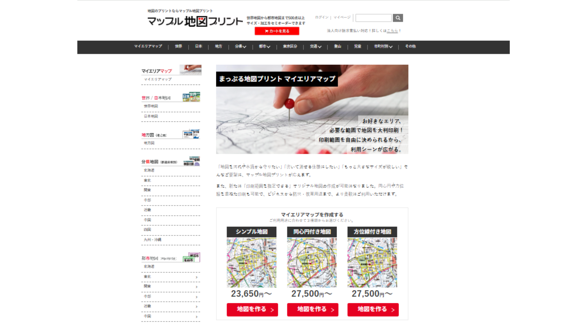 高額な特注地図を制作する予算がない場合でも、Webサイトから必要な時に必要な枚数だけを安価に注文できます。全国の市区町村を網羅した豊富なラインナップから、ベースとなる地図(道路地図、都市地図など)を選べるため、オーダーメイドに近い利便性を低コストで実現します。