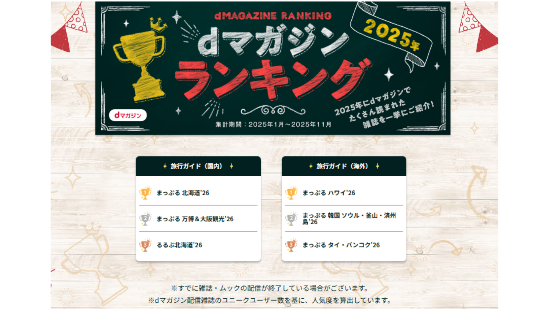 2025年dマガジンランキングで、「まっぷるマガジン」は国内・海外ともに年間1位を獲得(画像参照)。旅の情報を求めて能動的にガイド誌を読んでいる、旅へのモチベーションの高いユーザーにピンポイントで広告を表示できるため、高い訴求効果が期待できます。