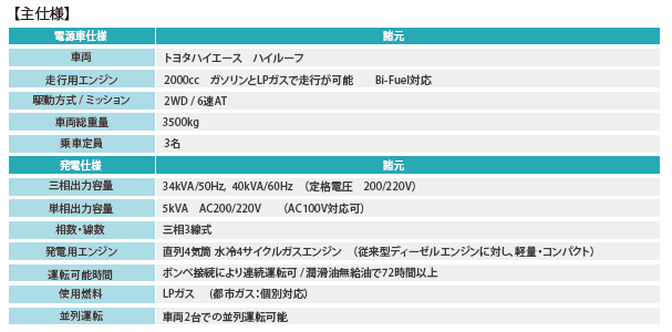ガソリンや軽油式の発電機対比CO2排出量も△30-40%程度と環境負荷が低い - 電力対応性能:三相出力容量:34kVA/50Hz、40kVA/60Hz