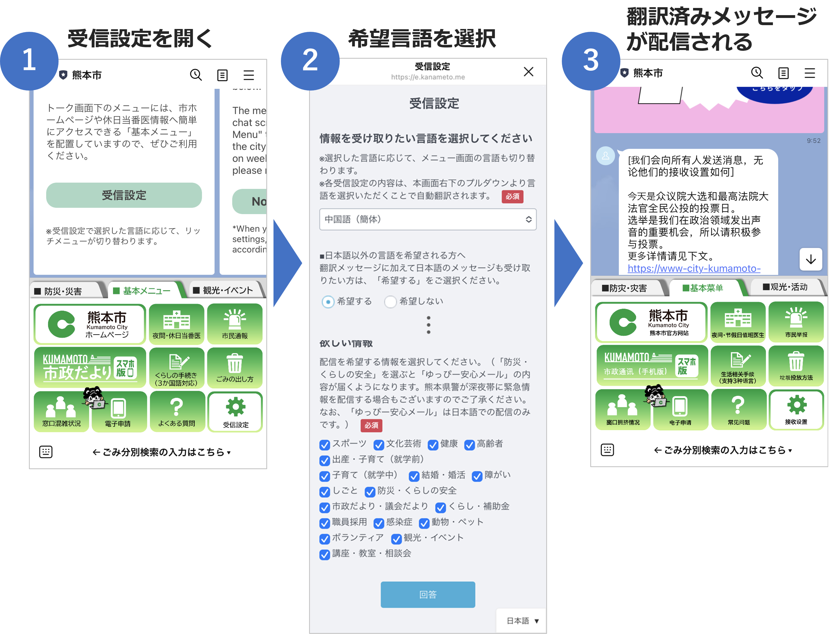 熊本市LINE公式アカウントを友だち追加すると、各言語で受信設定の回答を促すメッセージが表示されます。利用者は、情報を受け取りたい言語を登録すると、希望の言語に翻訳されたメッセージを受信できます。併せて、日本語原文の配信を希望すると、翻訳済みメッセージと日本語のメッセージのどちらも受け取ることが可能です。